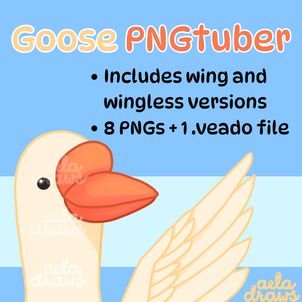 This silly goose is ready to be a PNGtuber! Includes 8 high-quality transparent PNGs (1600 x 1048 pixels) that can be used in PNGtuber software and a .veado file for a quick and easy recommended setup in veadotube mini.