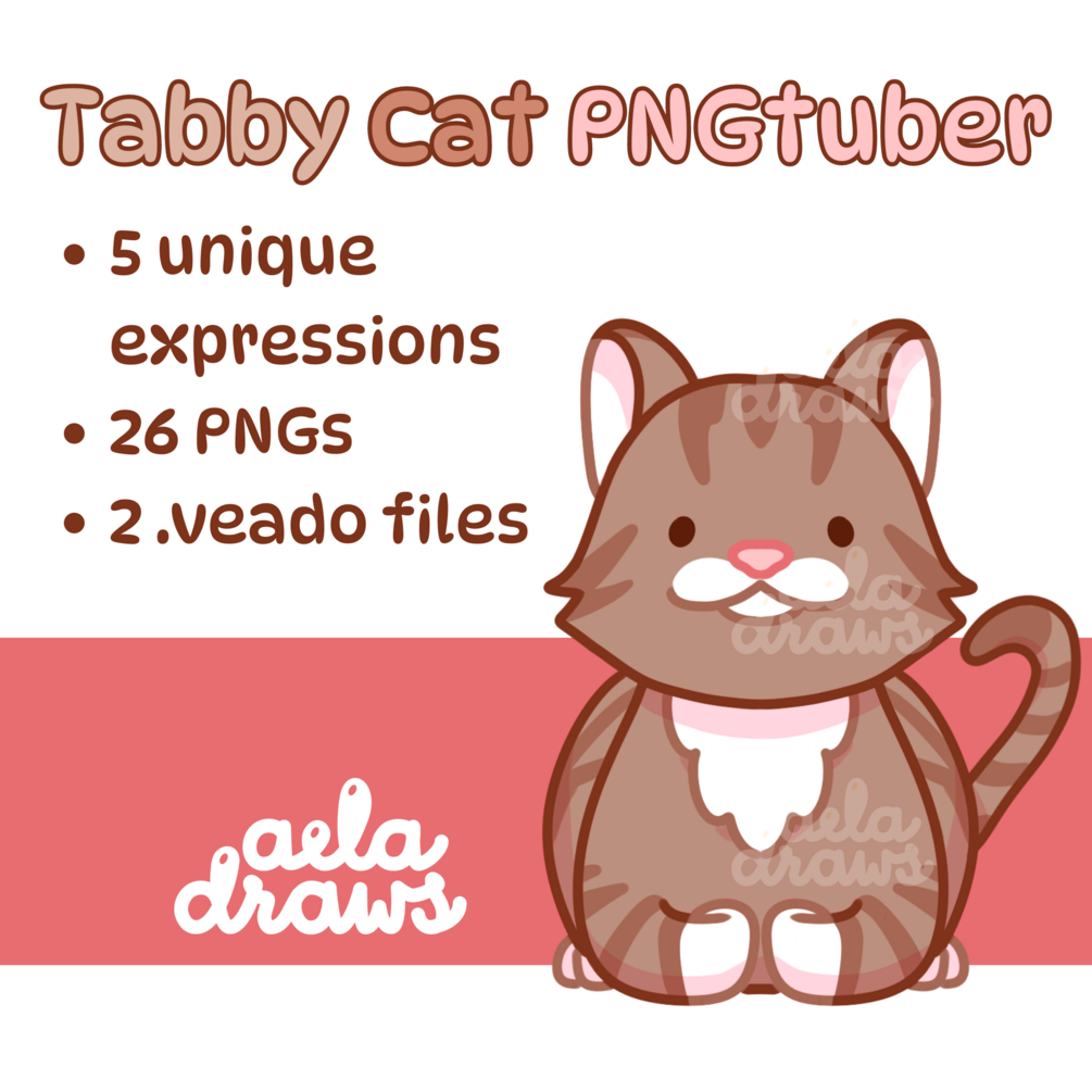 This little brown tabby cat is ready to be a PNGtuber! Five unique expressions are available through 26 high-quality transparent PNGs (1024 x 1024 pixels) that can be used in PNGtuber software and 2 .veado files (one for a mainly round-eyed cat and the other for a mainly squinty-eyed cat) for a quick and easy recommended setup in veadotube mini.